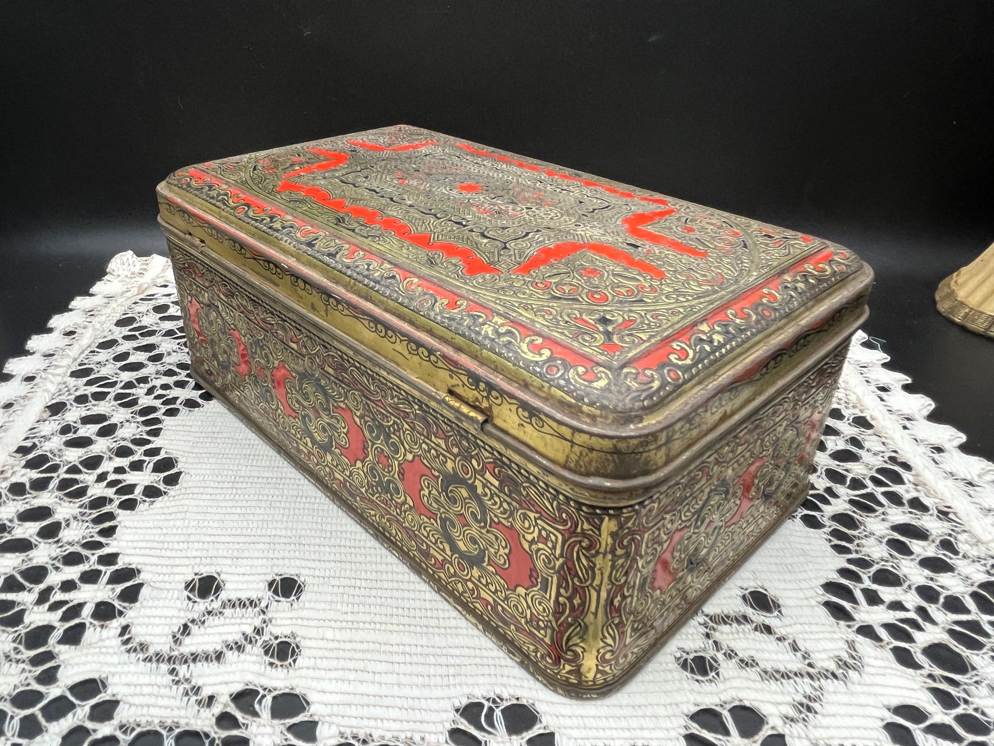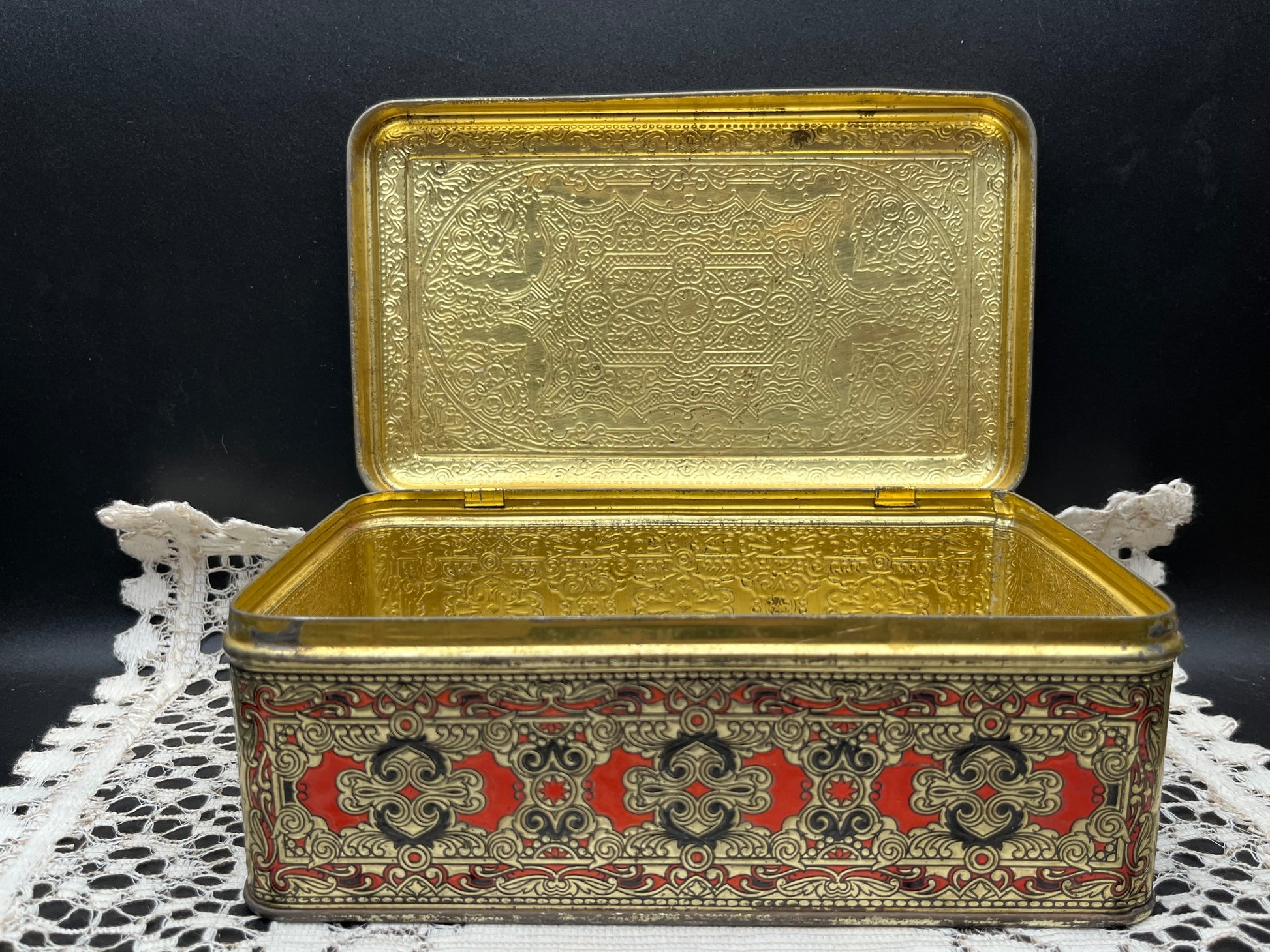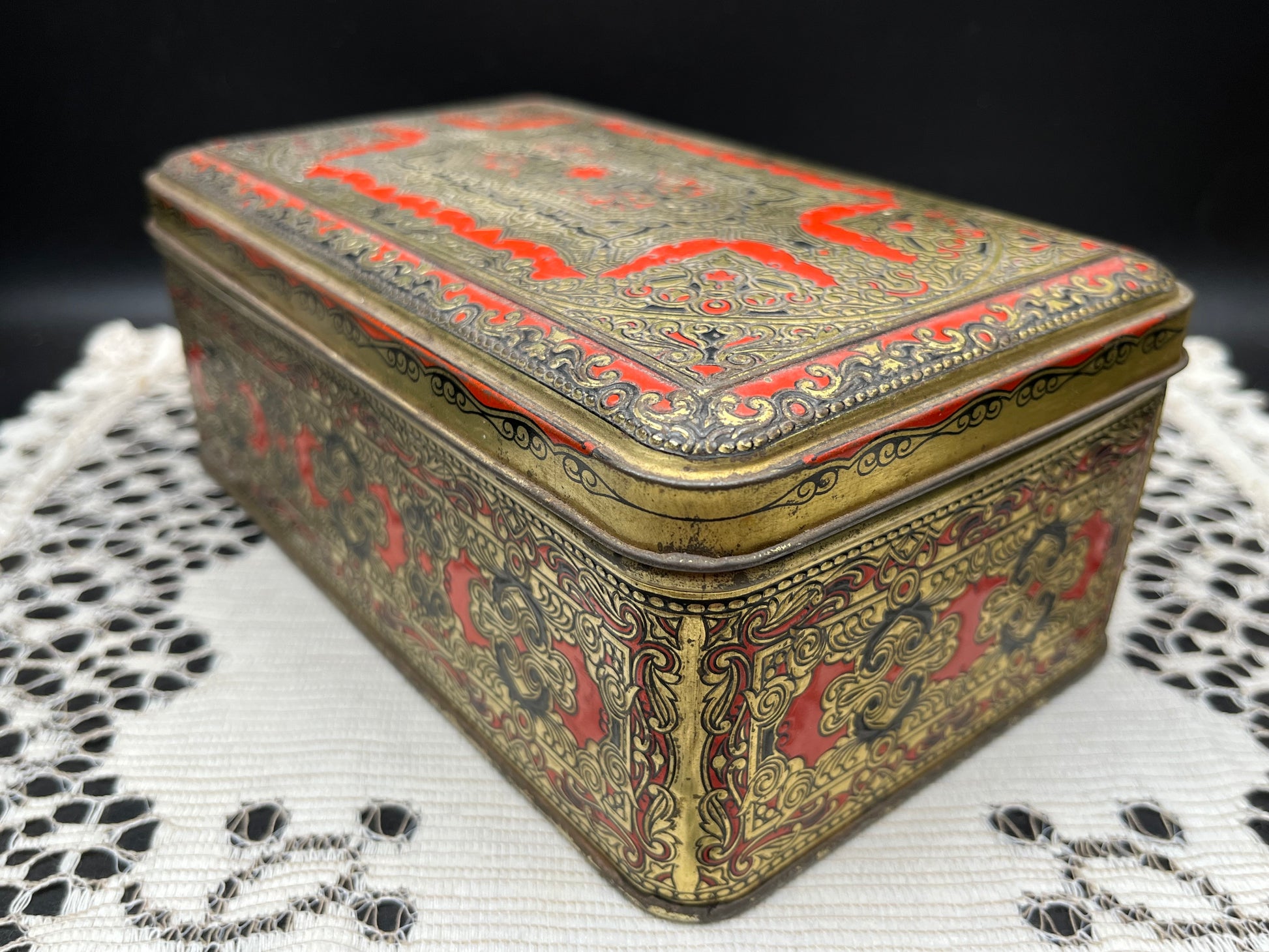 重厚感ある レッド × ゴールドのオリエンタル模様 が一面に施された、ヨーロッパ製のヴィンテージティン缶です。