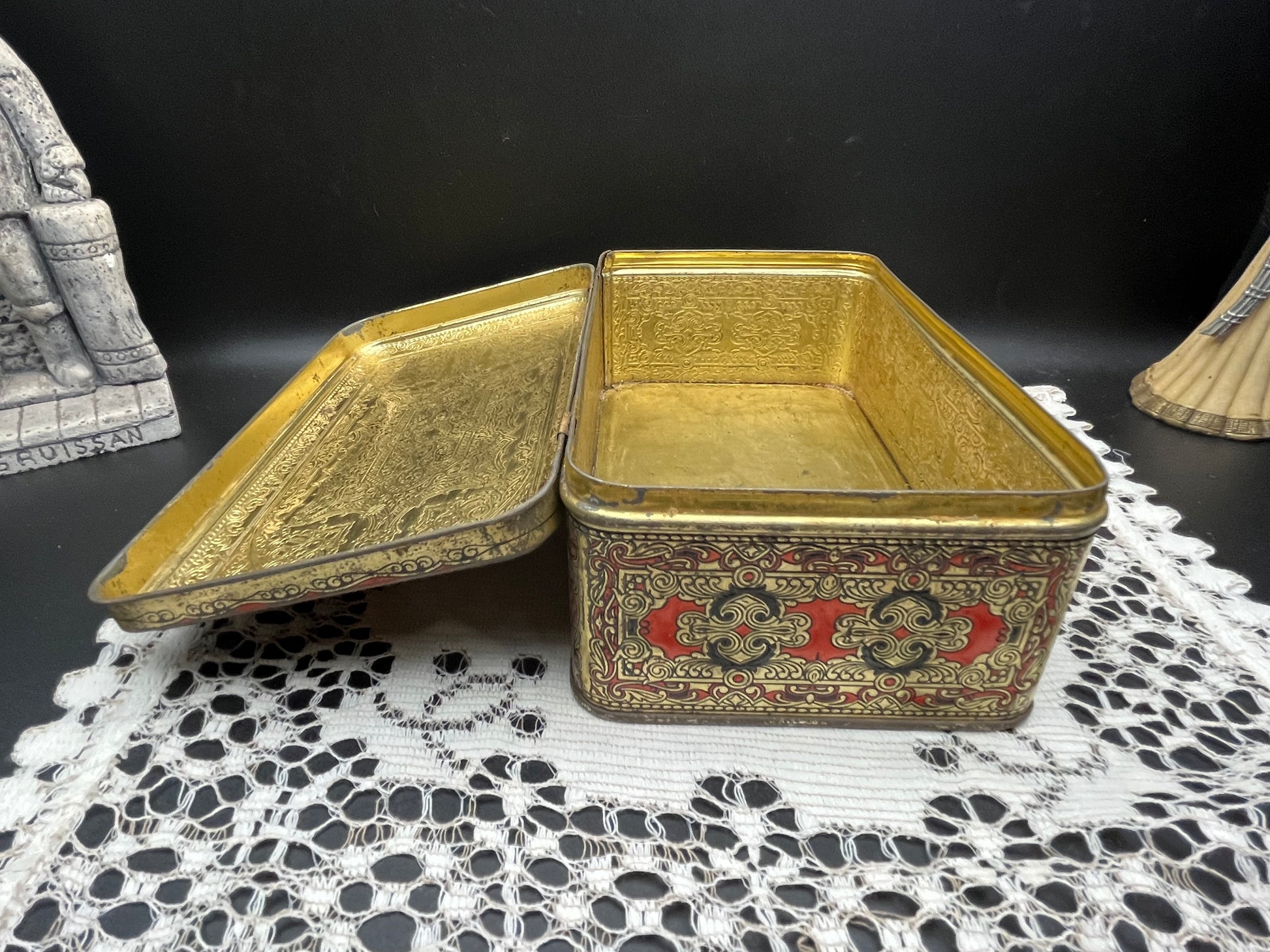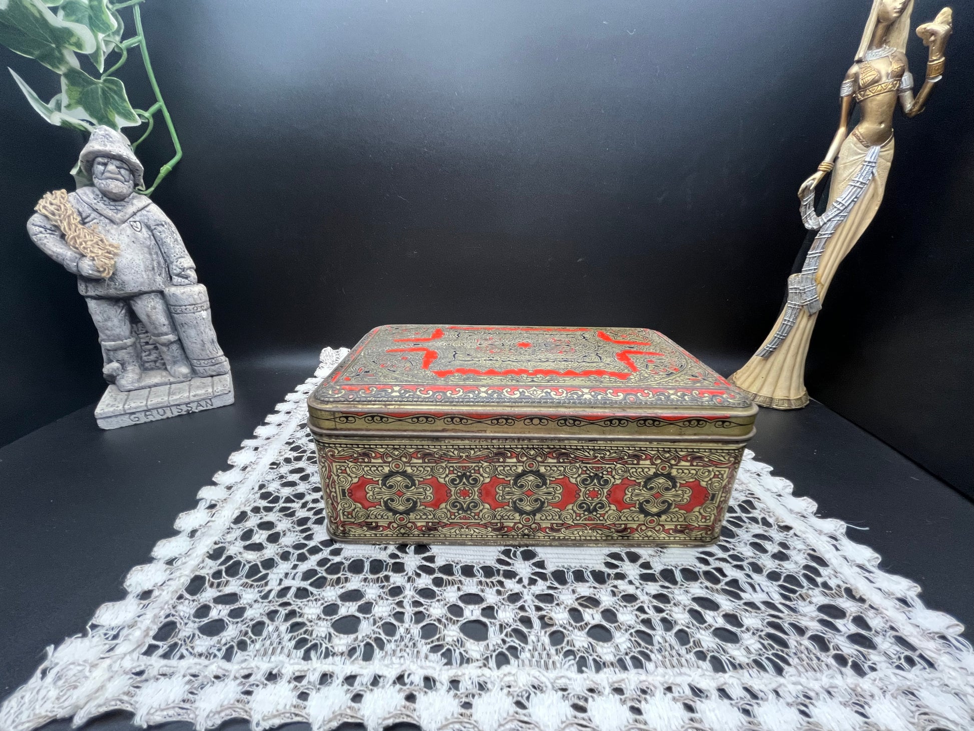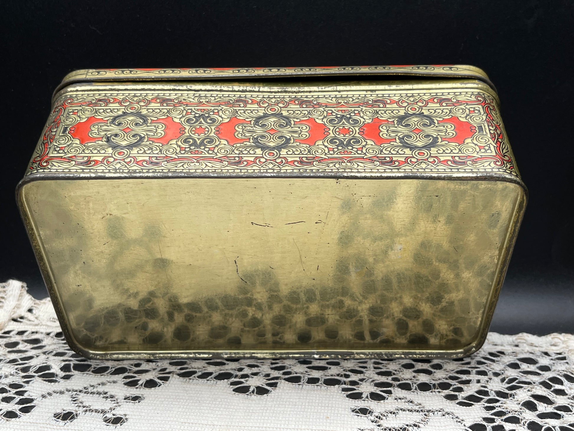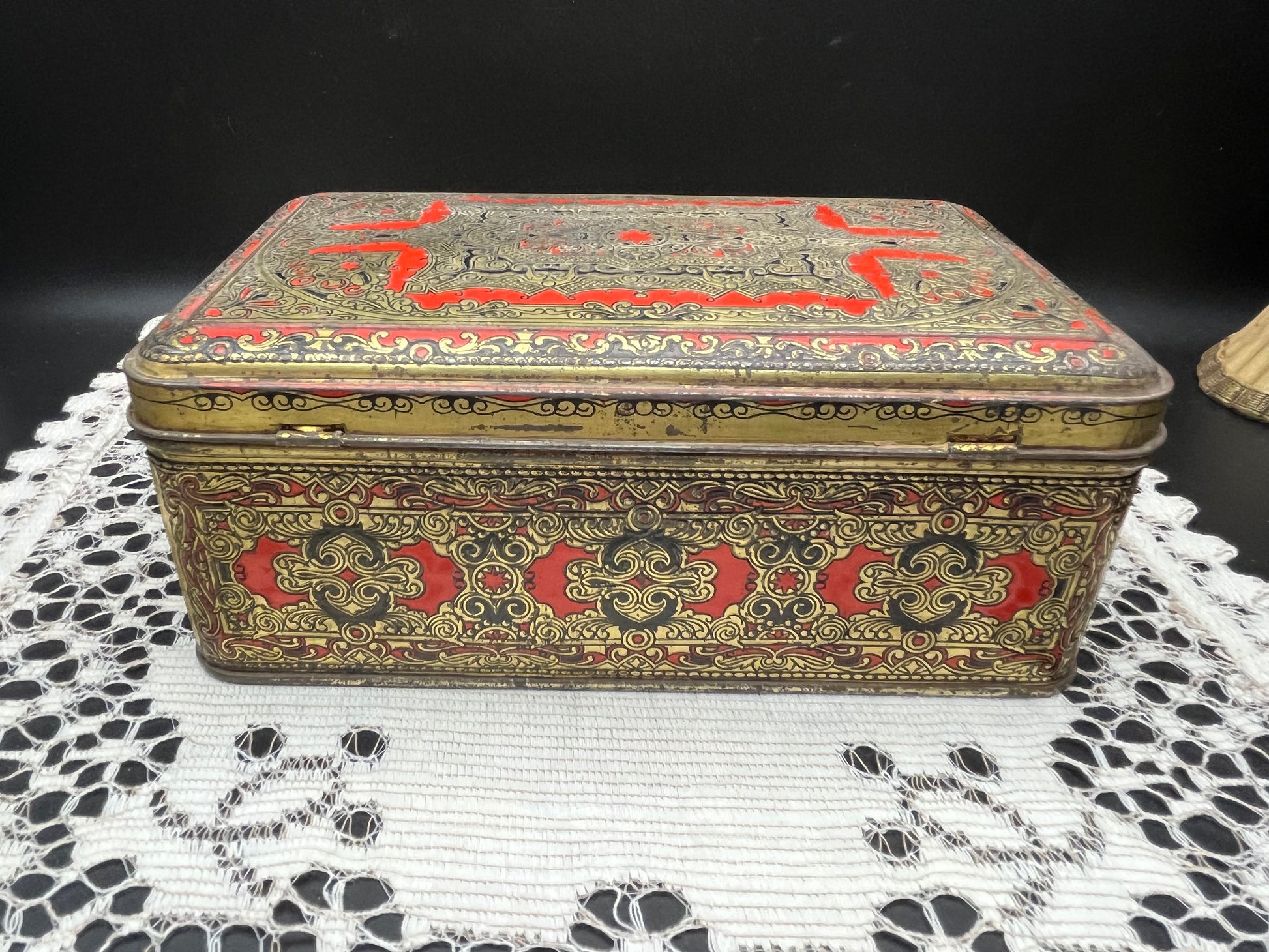 重厚感ある レッド × ゴールドのオリエンタル模様 が一面に施された、ヨーロッパ製のヴィンテージティン缶です。