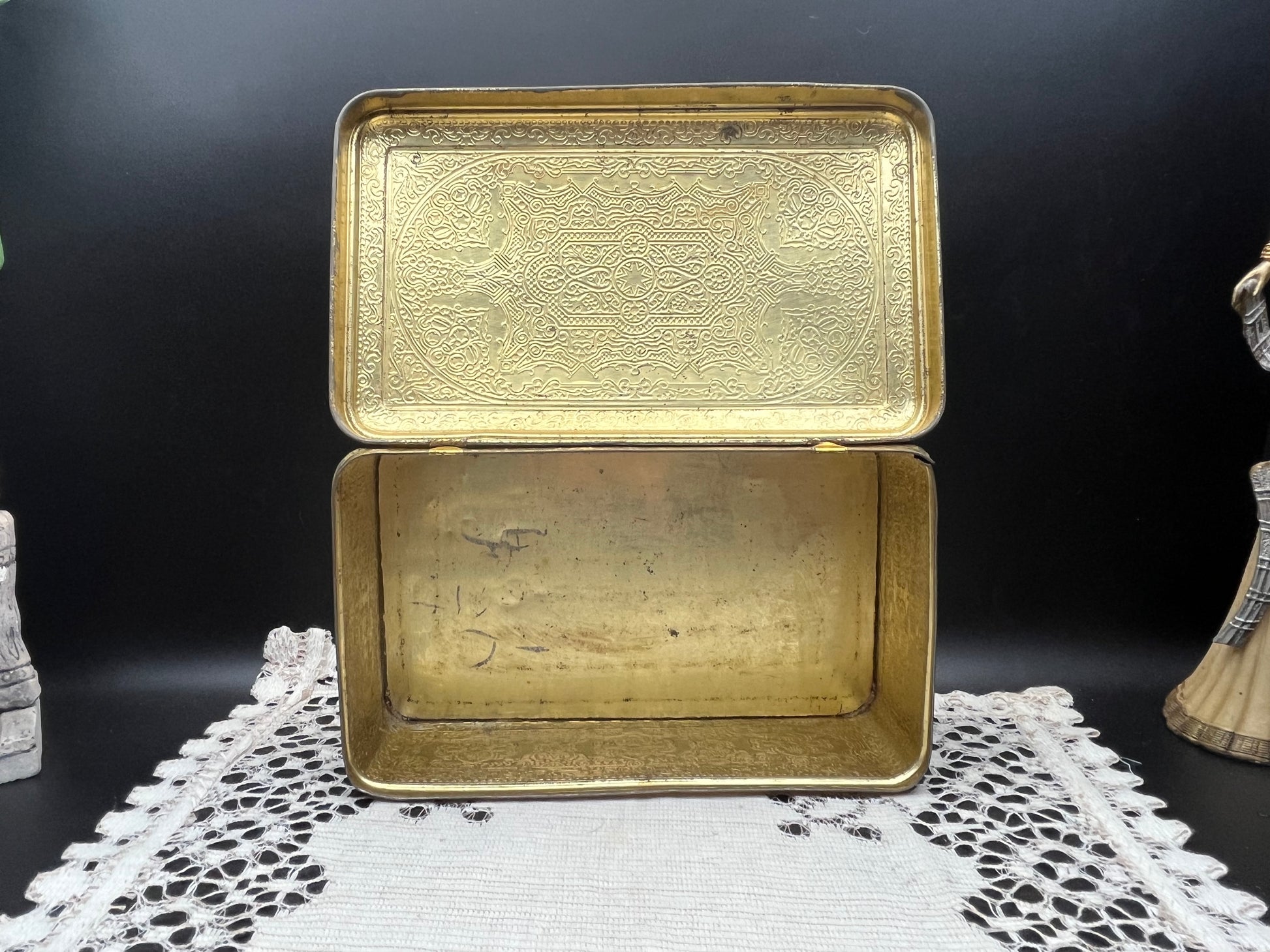 中東の装飾柄がクールな逸品ですが、長年の経年によるくすみ・スレ・小傷があります。それが味わいとなりアンティークらしい雰囲気を引き立てています。