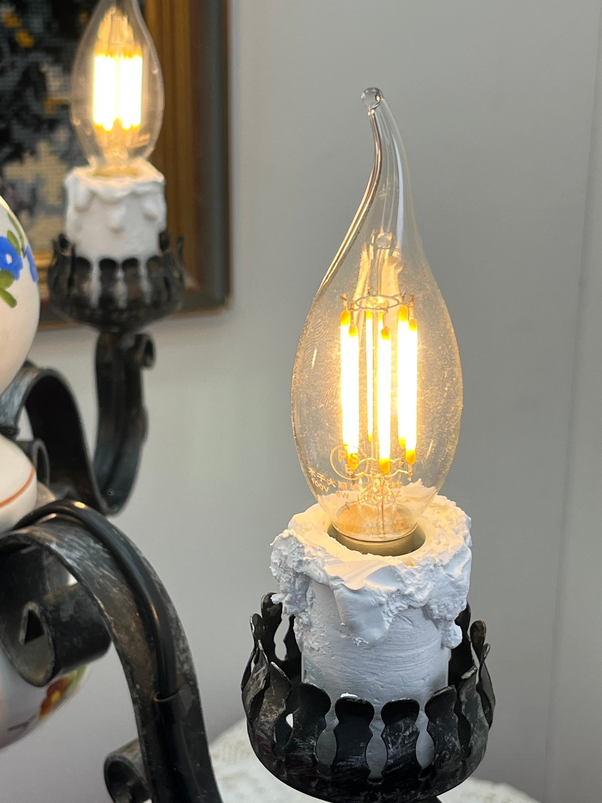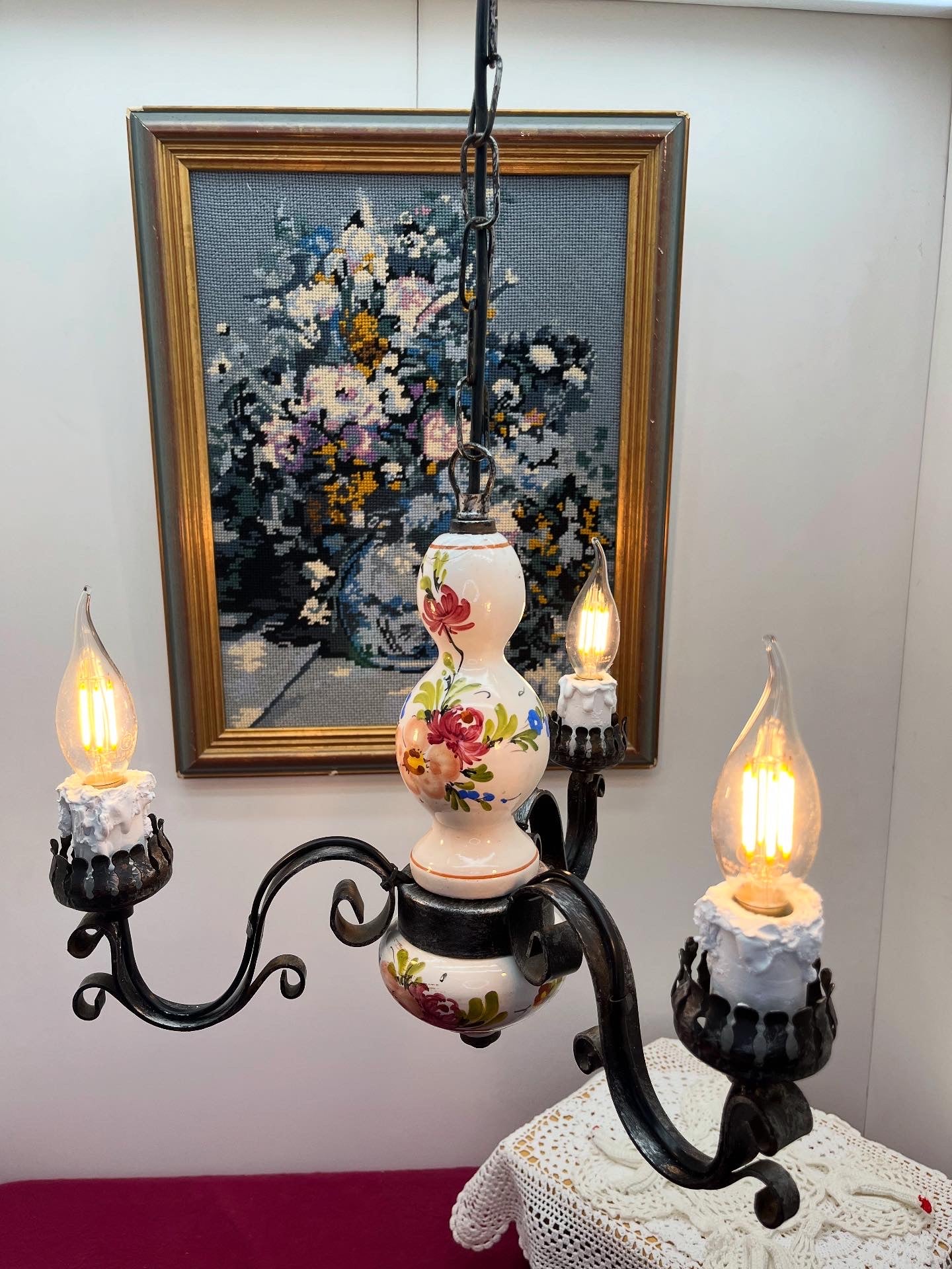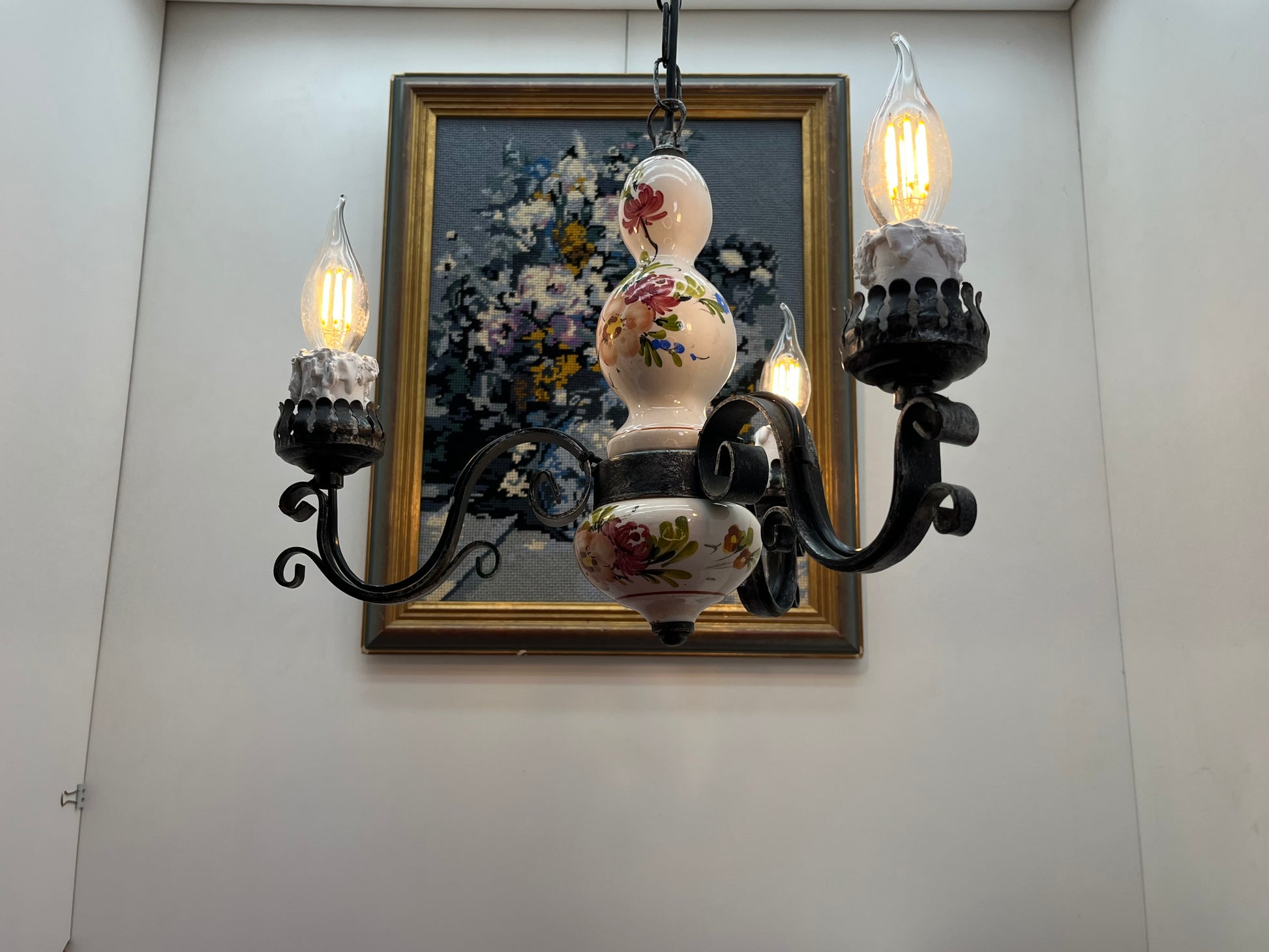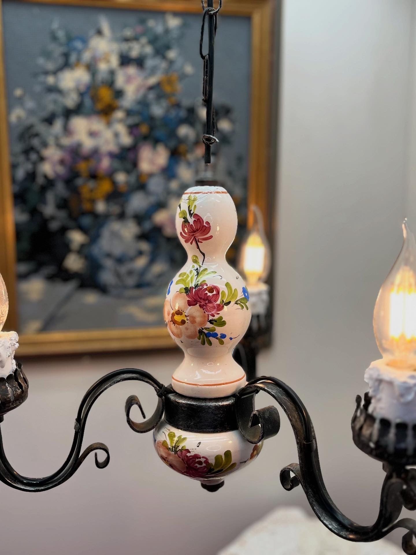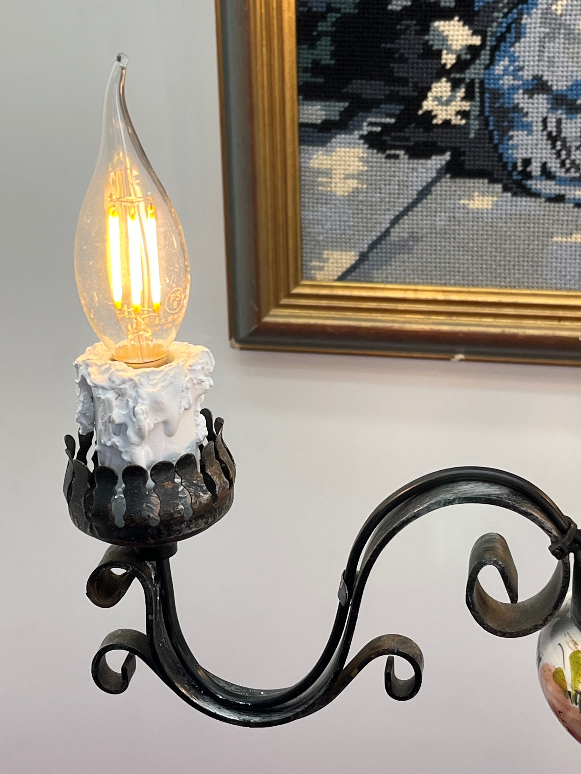 重厚感あるアイアンフレームに、ロウソクを模したソケット、そして温かみあるハンドペイントの陶器オーナメントが組み合わされた逸品。