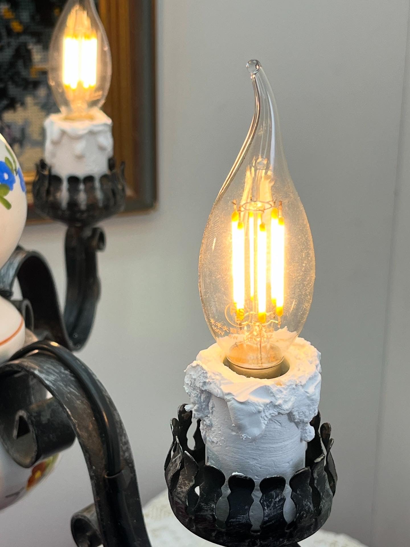 蝋が垂れたようなリアルな加工が施されたキャンドル型ソケットと、可憐な花模様の陶器が、空間を優雅に彩ります。