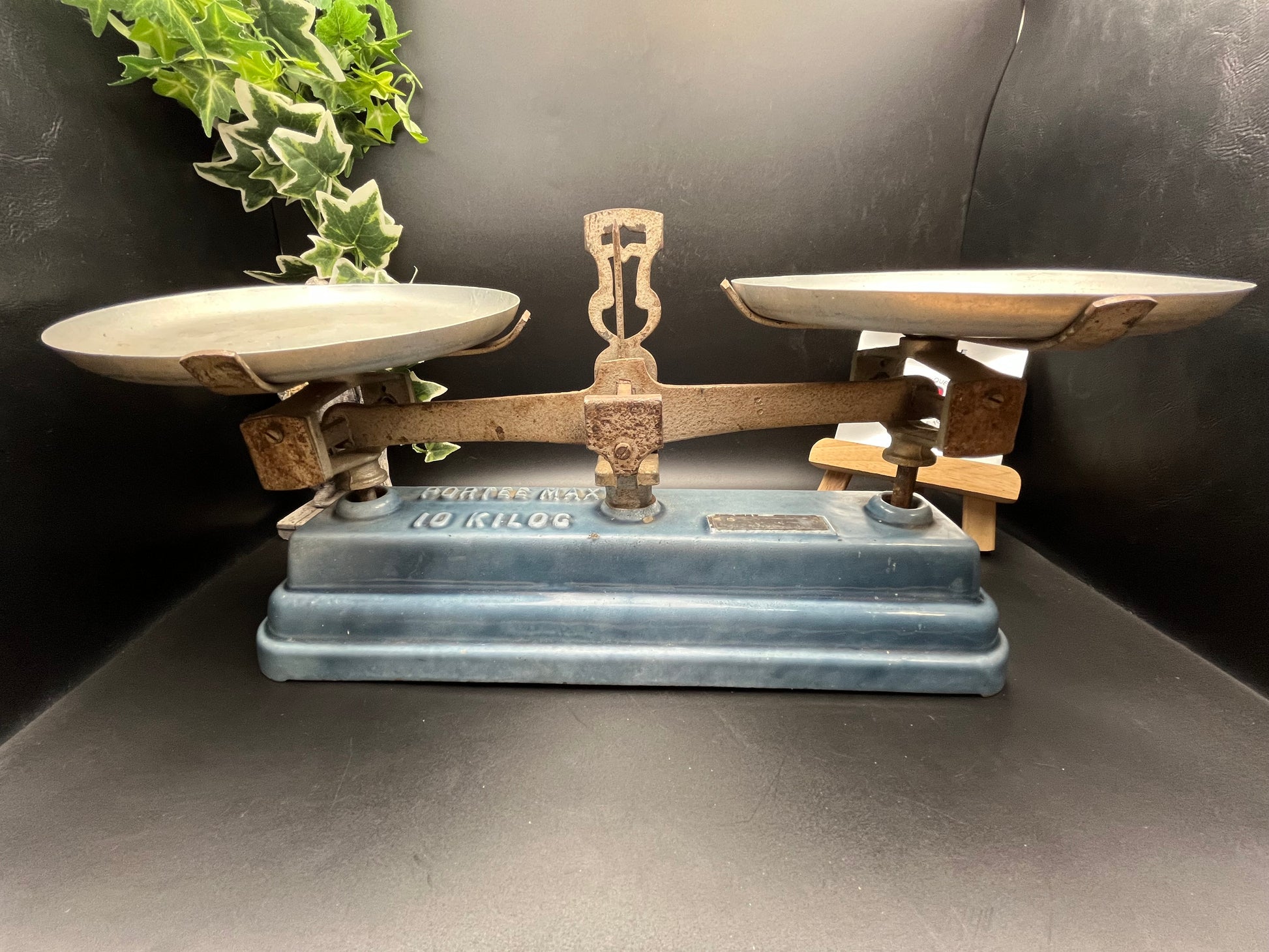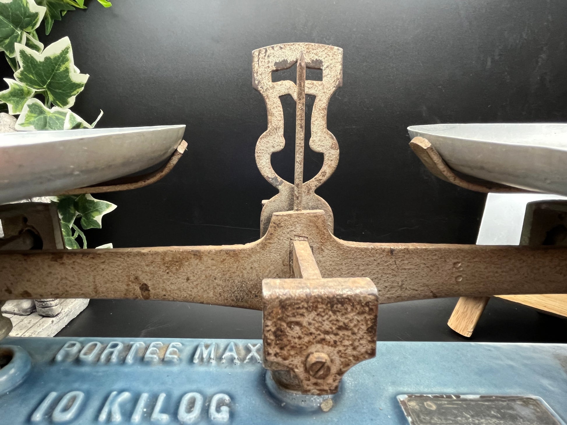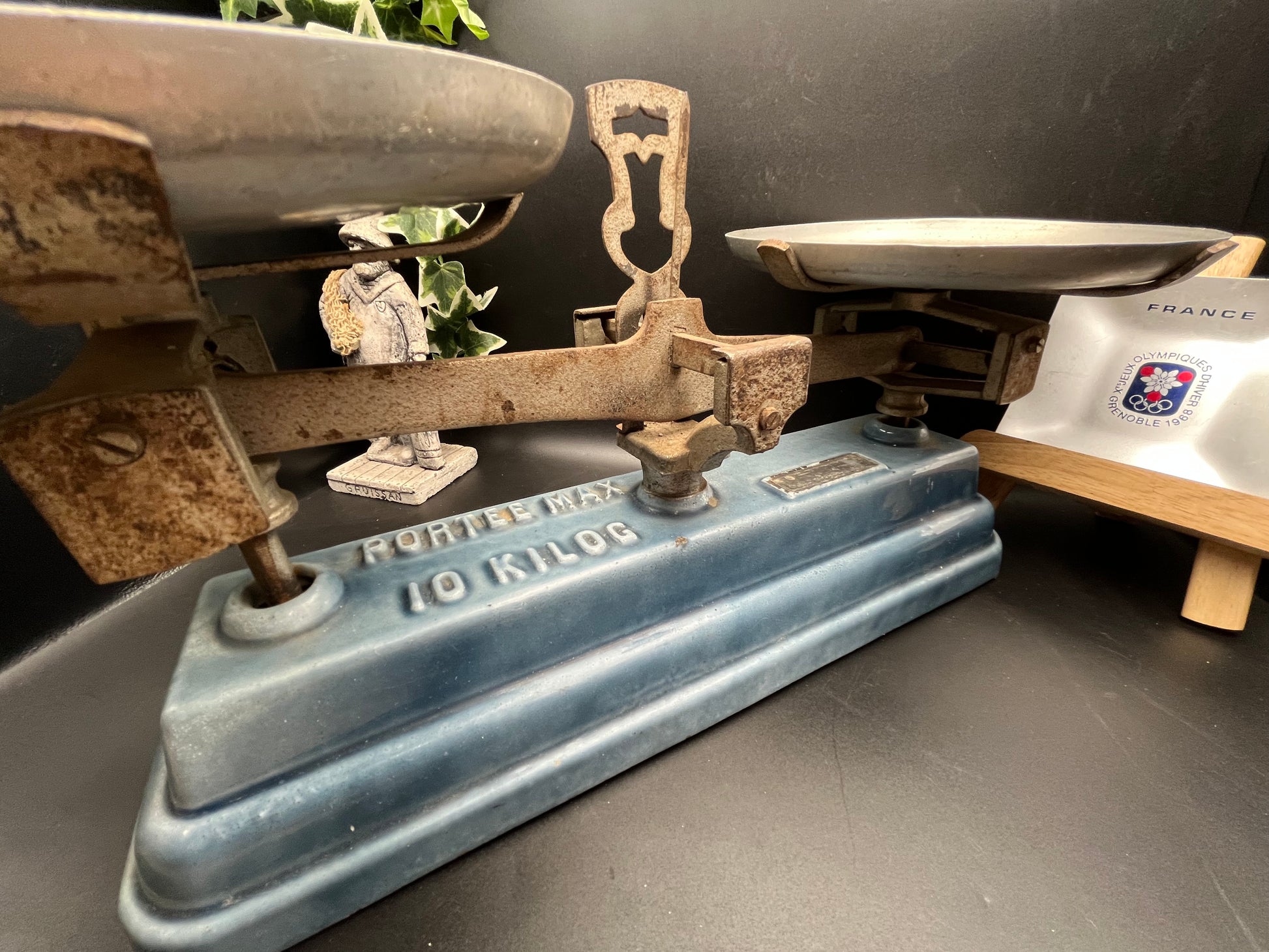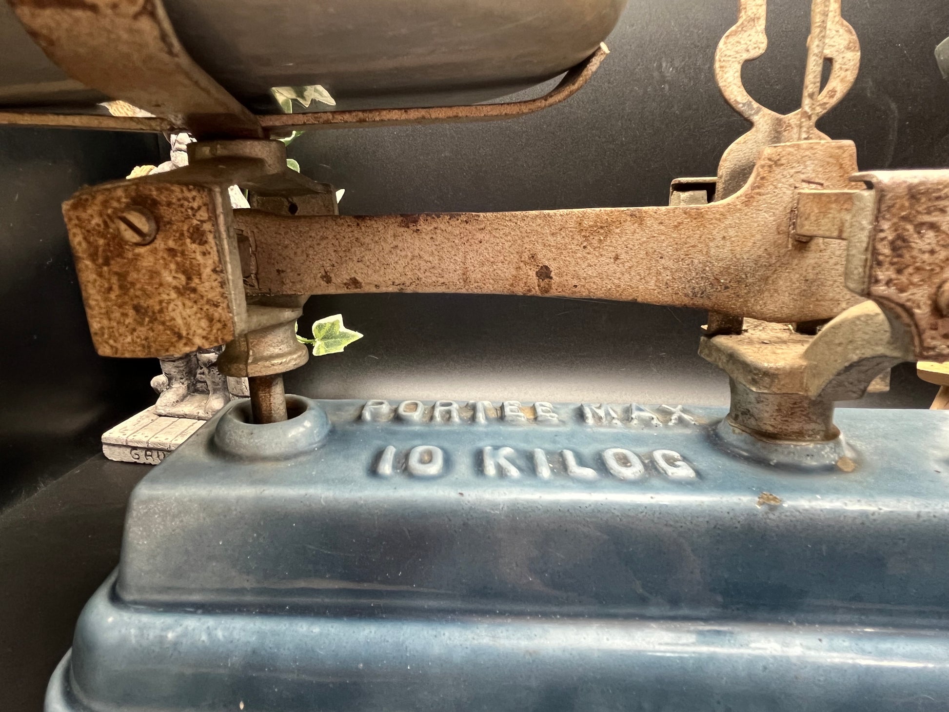 本体には「PORTÉE MAX 10 KILOG」の刻印があり、最大10kgまで計量できる実用モデルとして製造されたものです。